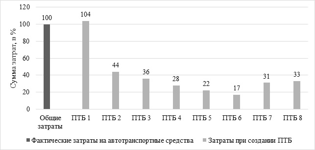 Согласно рисунку 4 установлено, что наименьшее снижение затрат на специализированные транспортные средства при создании шести ПТБ, что позволит существенно снизить бюджетные расходы на 83%.