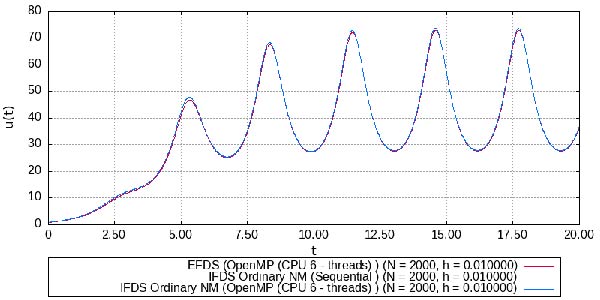 Так например, в данном исследовании рассматривается прямая задача Коши для нелинейного дробного уравнения Риккати с непостоянными коэффициентами, которая разрешается численно с помощью методов конечно-разностных схем [?]. Память описывается с помощью оператора дробной производной типа Герасимова-Капуто переменного порядка по времени. Такие модели еще называют нелокальными по времени [?]. Одним из способов решения является нелокальная явная конечно-разностная схема (EFDS). И с помощью технологий OpenMP удалось уменьшить в 3-5 раз время вычисления по EFDS [?]. Другой способ заключается в использовании неявных конечно-разностно схем (IFDS) и методов их решения [?].