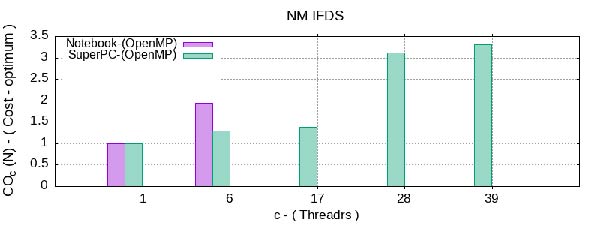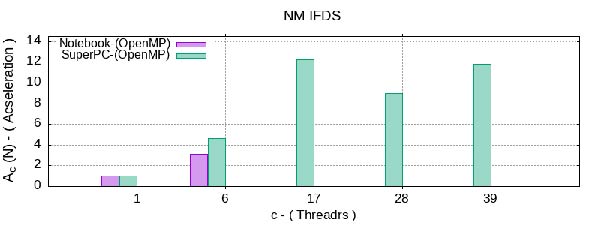 Из результатов анализа эффективности параллельного OpenMP алгоритма IFDS видно, что имеет место существенный прирост скорости вычисления, но при увеличении числа потоков для параллельной обработки, их эффективность заметно снижается. При одинаковых параметрах численного эксперимента обе вычислительные системы выдают искомый результат за приблизительно равное время вычисления. Однако наибольшая эффективность достигается при использовании 10-15 потоков. Из анализа данных видно, что OpenMP параллельная программная реализация IFDS показывает ускорение работы от 9 - 12 раз в зависимости от количества задействованных ядер CPU.