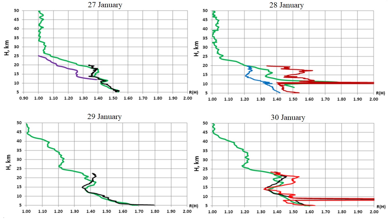 In Fig.2 vertical profiles obtained sequentially on the nights of January 27-30 are presented [?, ?]. The relief structure of the sonde profiles compared to the smoother lidar profile is explained by the difference in spatial resolution. For sonde measurements, signal processing was carried out with smoothing at 10 points (resolution 9-15 m depending on the balloon lifting speed). For the smoothing procedure, the formula is used (where T is the smoothed parameter, I is the smoothing result, K is the smoothing coefficient (in our case ). For lidar observations, the vertical resolution is ( 500 m) was achieved by smoothing over 3 strobes. Since in the AZOR launches the height of only 21-23 km was reached, the coefficient of molecular backscattering of light was used as a priori information, the same as in lidar calculations) according to the molecular model of the atmosphere[?].