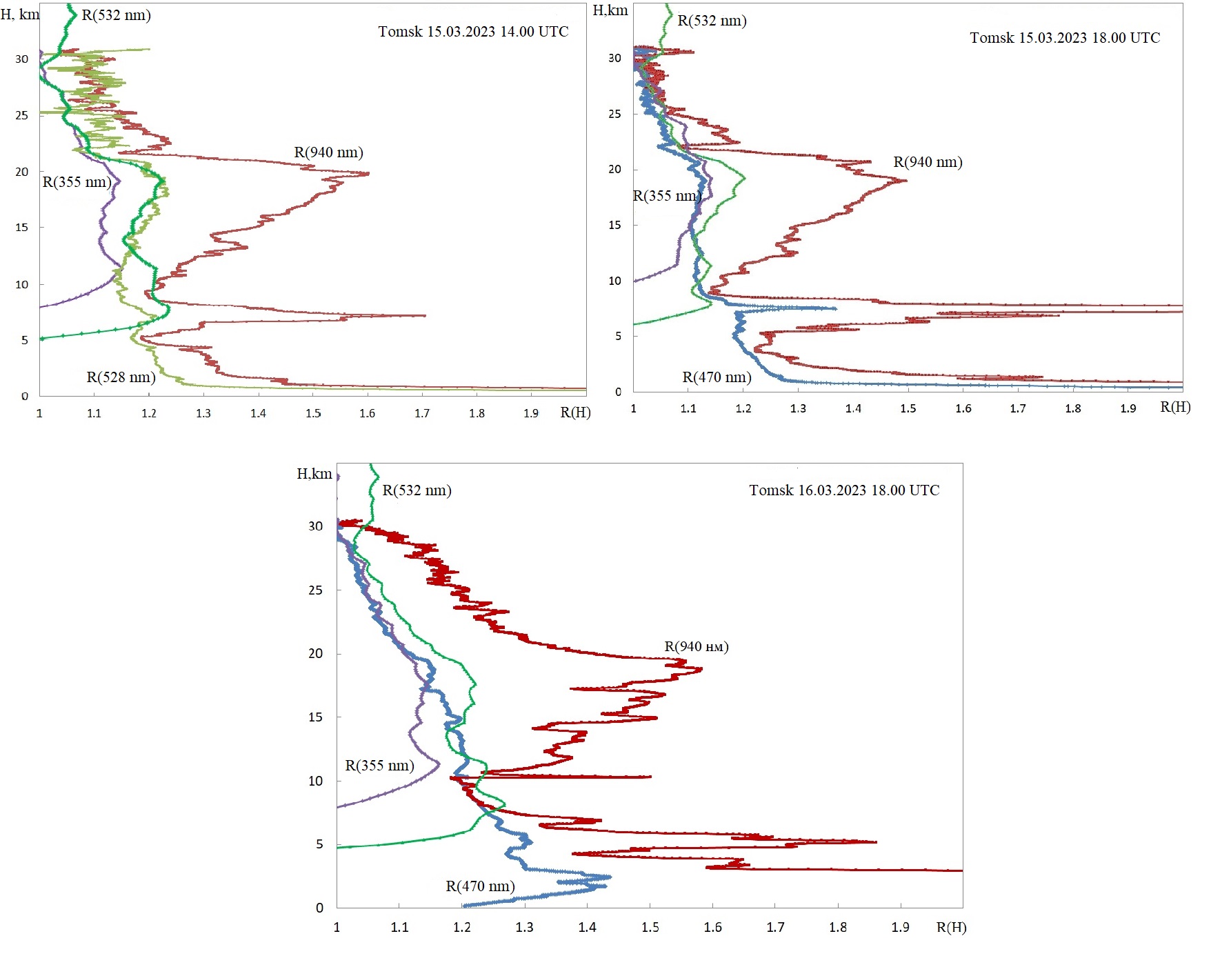 Fig. 3. Vertical profiles of the quantity R(λ,H) (see text) for the wavelengths indicated in the figure, obtained by the lidar and sonde. Lidar data in violet (355 nm) and dark green (532 nm). AZOR data are marked in blue (470 nm), light green (528 nm), red (850 nm) and dark red (940 nm).