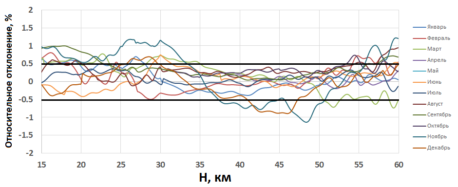 На рис. 3 показан вклад последних трех лет в общий расчет среднемесячных профилей температуры в средней атмосфере, выраженный в относительном отклонении СПТ за период 2010 – 2023 гг. от расчетов за 2010 – 2020 гг. Как можно видеть, исходное значение профилей температуры, при добавлении последних лет, за каждый анализируемый месяц, изменилось на ± 0.5 % для теплого периода времени и ± 1 % для холодного времени года во всем диапазоне высот 15 – 60 км при коридоре стандартного разброса годовых СПТ рассчитанных за 2010–2020 гг. в ± 2 % и ± 5 %, соответственно. Стоит отметить ноябрь месяц, в котором наблюдается повышение температуры на высотах 15–33 км на 1.2 % и снижение на 1.1 % в диапазоне 46–50 км от исходных значений за 2010–2020 гг.