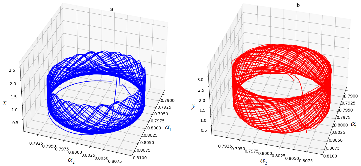 На рис. 1. приведены бифуркационные диаграммы в виде поверхностей искомого решения и от значений порядков дробных производных и . Отметим, что на поверхностях рис.1a и рис. 1b есть области которые отвечают за регулярные режимы, например, затухающие колебания соответствуют областям без всплесков, в области всплесков могут формироваться предельные циклы, а также предхаотические или хаотические режимы. Кроме того, мы видим область рваные области, что, как мы покажем дальше, связано с сингулярностью.