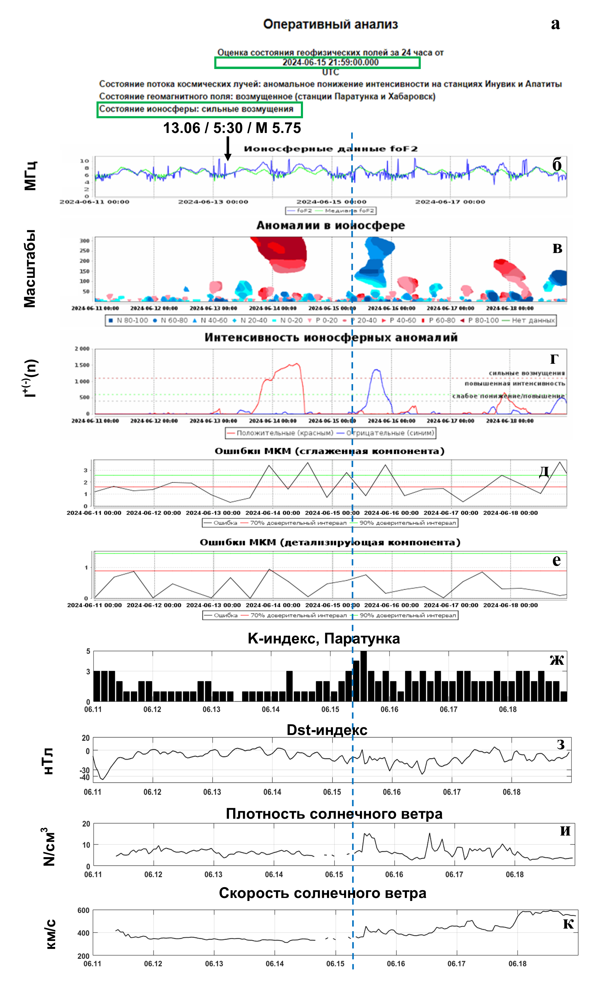 На рис. 3 представлен результат работы системы в период слабой магнитной бури, начавшейся 15 июня 2024 г. (min Dst = -28 нТл, момент начала бури отмечен вертикальным пунктиром). Предбуревый период характеризуется относительно спокойным состоянием геомагнитного поля (К-индекс не превышал значения 3, рис. 3 ж), скорость солнечного ветра составляла 320-370 км/сек (рис. 3 к), южная компонента ММП флуктуировала от Bz= -5 нТл до Bz= +7 нТл (https://ipg.geospace.ru).