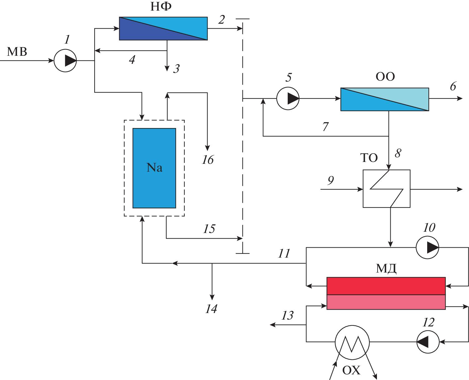 The article presents the results of a computational and analytical study of hybrid RO–MD (Reverse Osmosis–Membrane Distillation) technologies for desalination of the Caspian Sea, providing for the production of an additional amount of desalinated water by the MD method from RO concentrates heated to 50–80°C due to waste heat of fuel combustion products in steam boilers. Two options for solving the problem of the formation of CaCO3 and CaSO4 precipitates on membranes were studied: with preliminary nanofiltration (NF) or Na-cationation (Na) of sea water, as an alternative to the use of antiscalants (AS) and acid. The negative environmental effect of most plants (eutrophication of water bodies) and their low efficiency at high concentrations of desalinated water are taken into account. The Langelier index (СаСО3) and the degree of concentrate saturation (СаSO4) were used as criteria for precipitation of deposits on the membranes. The NF and RO processes were studied using the ROSA computer program, and the MD and Na processes were studied by computer simulation of the corresponding calculation models. It was found that at a 70% permeate yield at the NF and RO stages, the possibility of calcium precipitation on the RO and MD membranes is prevented, but their precipitation on the NF membranes is predicted, which makes the use of AS forced. At the same time, additional permeate production at the MD stage from RO concentrates reaches 40% of the amount of permeate from RO stadium, and the electricity consumption in general according to the scheme is 1.88 kWh/m3. Reducing the calcium hardness of sea water to 50 µg-eq/dm3 by the Na-cationization method makes it possible to refuse both the use of AS and acidification with sulfuric acid with additional production of MD permeate – 27% relative to RO permeate. Electricity consumption rises to 2.5 kWh/m3. To use the known advantages of NF without the use of AS, a hybrid Na–NF–RO–MD scheme is proposed. It has been established that at 80% yields of NF and RO permeates, to prevent the formation of CaSO4 precipitates at all stages of treatment, it is sufficient to reduce the hardness of sea water from 16 to 5.5 m-eq/dm3, and by acidifying the softened water to exclude the formation of CaCO3 precipitates.