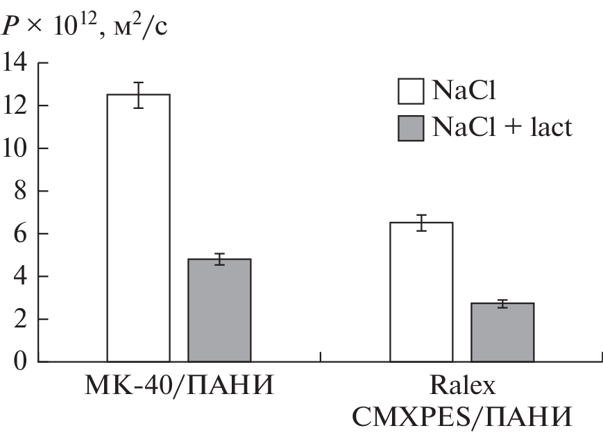of lactose in a solution leads to a decrease in the conductivity of all studied membranes. However, the most significant effect is manifested for MK-40 membrane modified by polyaniline: its electrical conductivity is reduced by 15–25%. The diffusion permeability of the anion-exchange and initial cation-exchange membranes is poorly dependent on the presence of lactose in the solution. However, its decrease is observed by 2–2.5 times in the case of cation-exchange membranes modified by polyaniline. A significant effect of lactose on the current-voltage characteristics of the anion-exchange membranes has been found. This fact indicates significant adsorption of lactose on membrane surface in an external electric field. It is shown that ion-exchange membranes remain quite effective for electrodialysis of hydrochloric serum solutions, but their use is more effective at under limiting current modes.