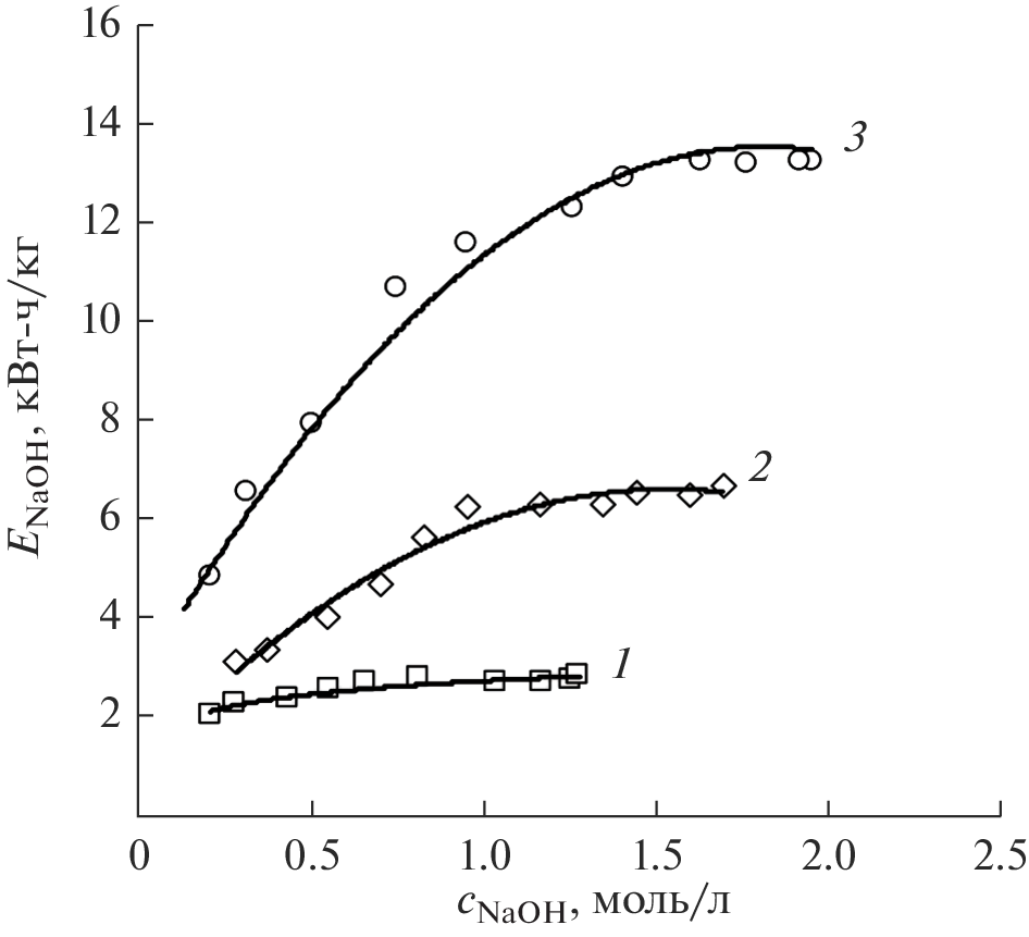 This study explores the production of sodium hydroxide via bipolar electrodialysis using MB-3 membranes and a laboratory electrodialyzer-synthesizer with a three-chamber unit cell (five elementary cells, active area of each membrane 1 dm2). The research compares the use of sodium carbonate and sodium sulfate as initial solutions. The results show that sodium carbonate leads to a higher concentration of the resulting alkali under comparable process conditions. The alkali current efficiency is more than 70% when using sodium carbonate, while it drops sharply to 0.4–0.5 when using sodium sulfate. The energy consumption for transferring one kilogram of alkali ranges from 2.8–13.9 kWh/kg at operating current densities of 1–3 A/dm2.