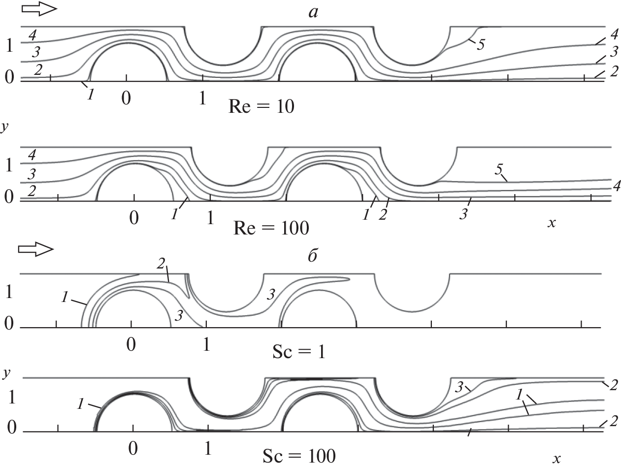 The external stationary flow of a viscous incompressible fluid and the convective-diffusion mass transfer of a solute in an ordered system of parallel hollow fiber membranes arranged normally to the flow direction are calculated in the ranges of Reynolds numbers \(\operatorname{Re} \) = 0.01–100 and Schmidt numbers \({\text{Sc}}\) = 1–1000. The Navier–Stokes equations and the equation of convective diffusion were solved using the methods of computational fluid dynamics with a no-slip boundary condition and with a constant solute concentration condition on the outer surface of the streamlined fiber. The calculations were performed for a row of fibers and for a multi-fiber system consisting of four and sixteen rows of fibers. The outlet concentrations and the fiber solute retention efficiencies \(\eta \) were calculated depending on the packing density of the fibers and the \(\operatorname{Re} \) and \({\text{Sc}}\) numbers. It is shown that it is possible to use the fiber solute retention efficiency \(\eta \) defined for a single row of fibers to predict the retention efficiency of an extended multi-row fibrous bed.