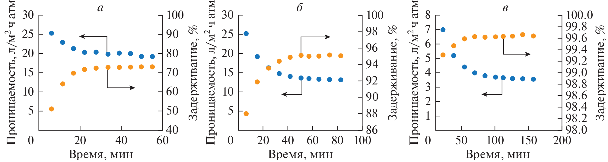 With the development of oil fields, the proportion of the highest molecular weight component, asphaltenes, increases in the composition of the extracted raw materials. The tendency of asphaltenes to aggregate causes a number of problems, which makes the problem of oil deasphalting relevant. In this work, studies were carried out on the separation of the asphaltene fraction from oil using PAN membranes. In order to reduce the pore size of membranes obtained by the phase inversion method, an additional component, acetone, was introduced into the spinning solution. The permeability of the resulting membranes for water is 37.6 ± 1.7 L/(m2 h atm), and for toluene, 25.3 ± 1.8 L/(m2 h atm), and the pore size is 4.6±0.5 nm. When filtering oil solutions diluted with toluene (1 g/L), the retention capacity of membranes for asphaltenes was 73 ± 4% and more than 95% if the oil content in the solution was more than 10 g/L. A study was made of the parameters of membrane clogging during the filtration of oil solutions in toluene. It is noted that when passing from toluene to oil solutions, the permeability of membranes decreases by 10 times. At the same time, the decrease in permeability is reversible, and when the oil solution was replaced with a pure solvent, the membrane restored up to 99% of its permeability.