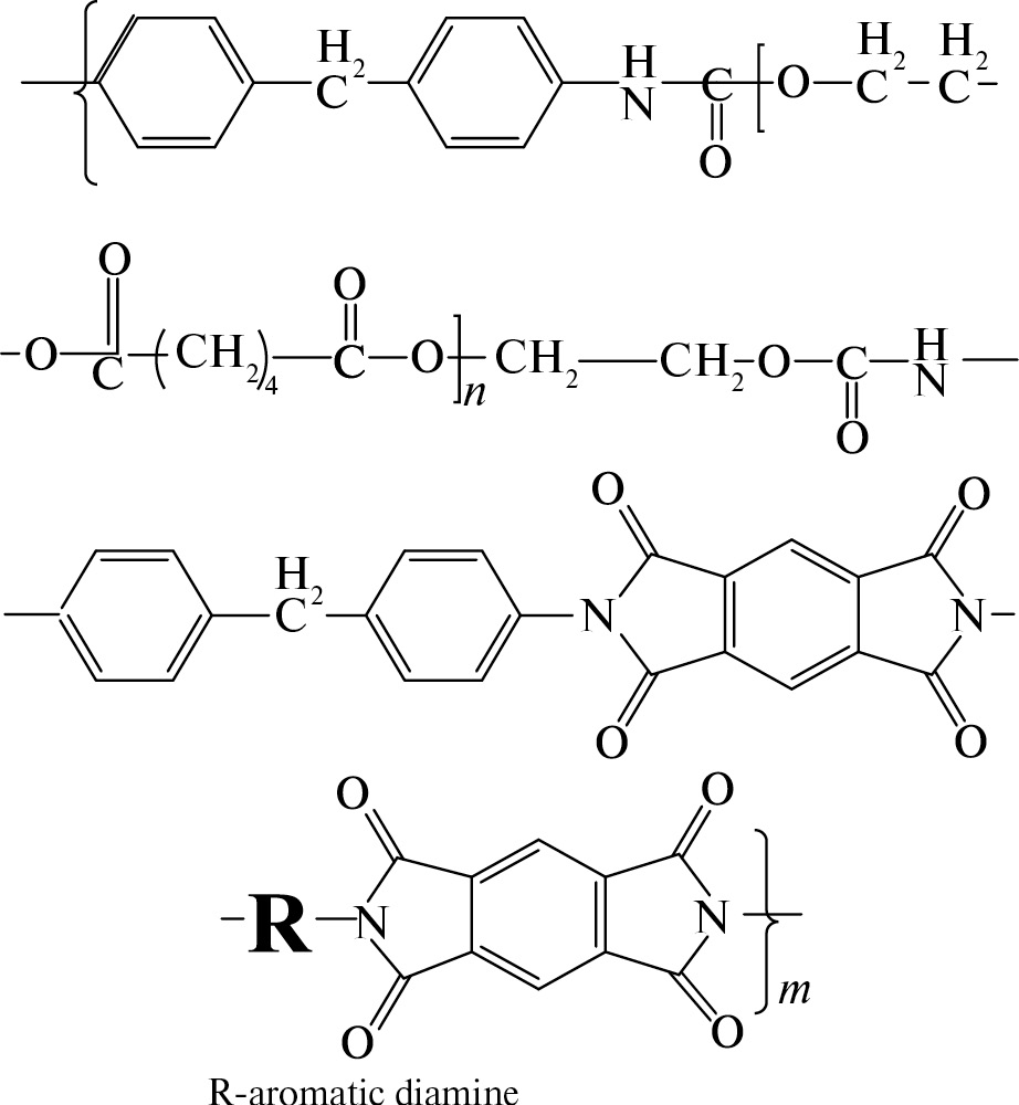 По своему строению (архитектуре) мультиблочным (сегментным) сополи(уретан-имидам) соответствует общая формула [А – (В)k]n. В каждом повторяющемся звене этих сополимеров содержится жесткий блок мономера А (ароматического имида, обрамленного уретановыми группами) и гибкий блок (В)k алифатического полиэфира, входящего в полиуретан. Как отмечалось, блоки А и (В)k термодинамически плохо совместимы и образуют в объеме сополимера микрофазы. В общем свойства сополи(уретан-имидов) опредеделяются комбинацией гибкости цепей полиэфирных сегментов, жесткости (уретан-имидных) сегментов, разделением и частичным взаимопроникновением фаз, водородными связями, π-π-взаимодействиями бензольных колец и другими межмолекулярными взаимодействиями. Требуется пояснить, что полиуретаны получают при взаимодействии алифатических полидиолов (т.е. простых или сложных полиэфиров, имеющих концевые гидроксильные группы) с ароматическими диизоцианатами. Детальные прописи синтеза сегментных поли(уретан-имидов) приводятся в работах [18, 19].