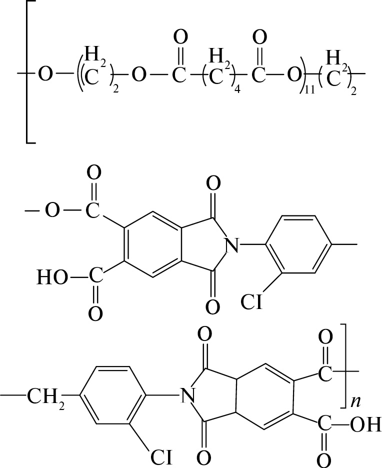 Близкими аналогами поли(уретан-имидов) являются поли(эфир-имиды), под которыми следует понимать сегментные сополимеры ароматических полиимидов и алифатических сложных эфиров. В [21] предлагаются мембраны на основе мультиблочного (сегментного) сополи(эфир-имида), в структуру которого в качестве жесткого сегмента входит имид и в качестве гибкого сегмента – алифатический сложный полиэфир (в отсутствии уретановой связи в основной цепи и наличии карбоксильной группы в боковой цепи). Первапорационные свойства приводятся для случаев поли(эфир-имидов), приготовленных с использованием в качестве мономеров полиэтиленадипинатдиола (Mn = 2000, 1000, 500 г/моль) и полиэтиленсукцинатдиола (Mn = 2000 г/моль) соответственно, пиромеллитового ангидрида и метилен-ди(орто-хлор)анилина. Химической структуре полимеров на основе полиэтиленадипинатдиола соответствует формула:
