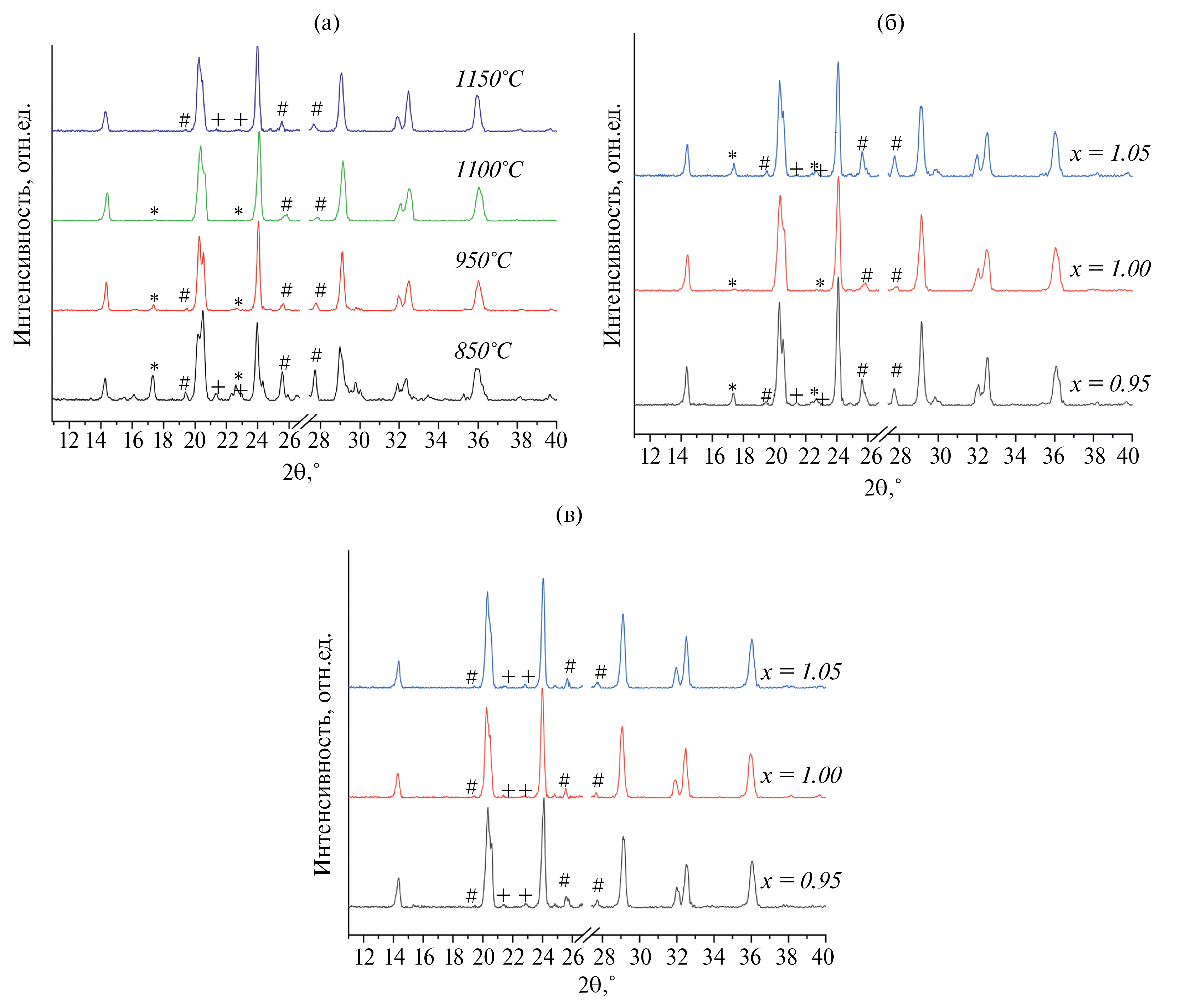 Рис. 1. Фрагменты рентгенограмм LiNbCr(PO4)3, полученного при температурах 850–1150°С (а), Li3−2xNbxCr2−x(PO4)3 (х = 0.95, 1.00, 1.05), синтезированных при 1100°С (б) и 1150°С (в). В области 2Ɵ~27° вырезаны фрагменты, содержащие рефлексы германия, который использовался в качестве стандарта. Символами +, # и * обозначены примесные фазы моноклинной и тетрагональной модификаций NbOPO4 и LiCrP2O7