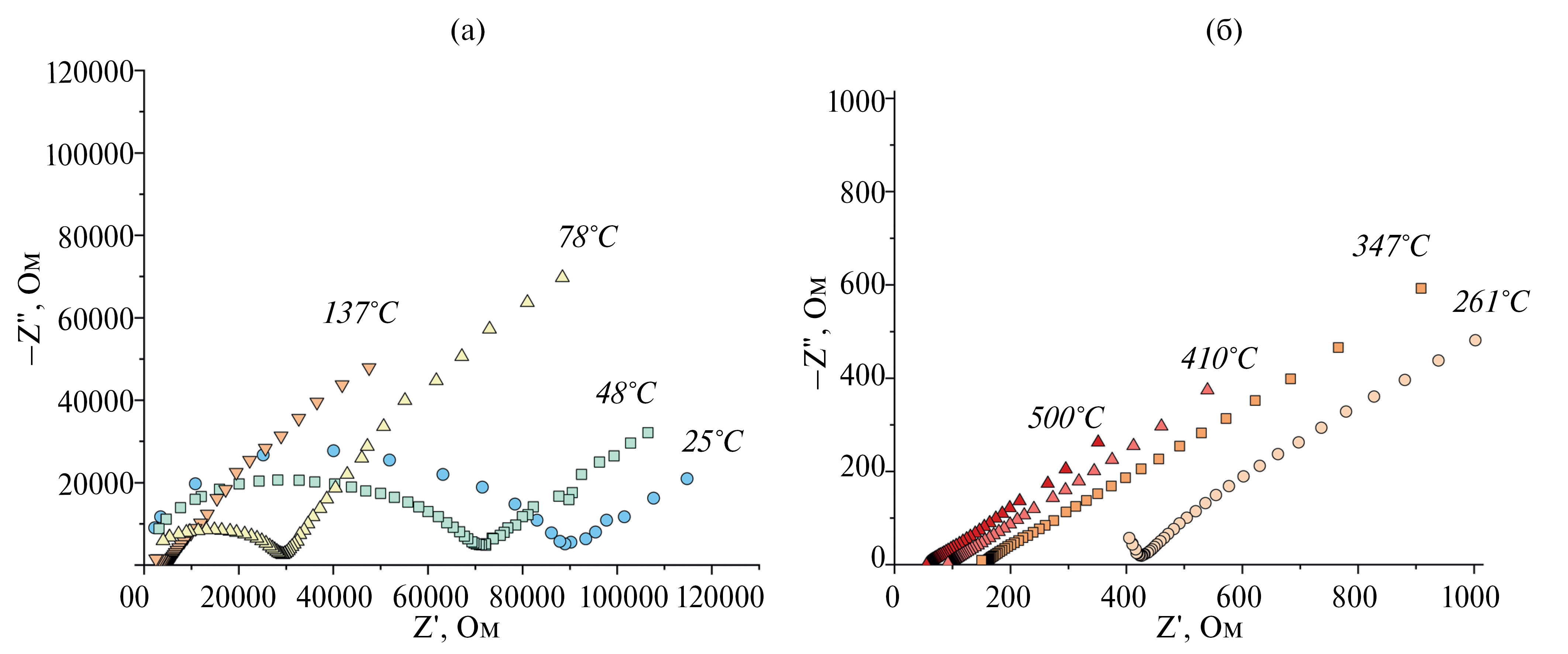 Рис. 2. Типичные годографы импеданса на примере Li0.9Nb1.05Cr0.95(PO4)3 при различных температурах (а, б). Температуры приведены на рисунке