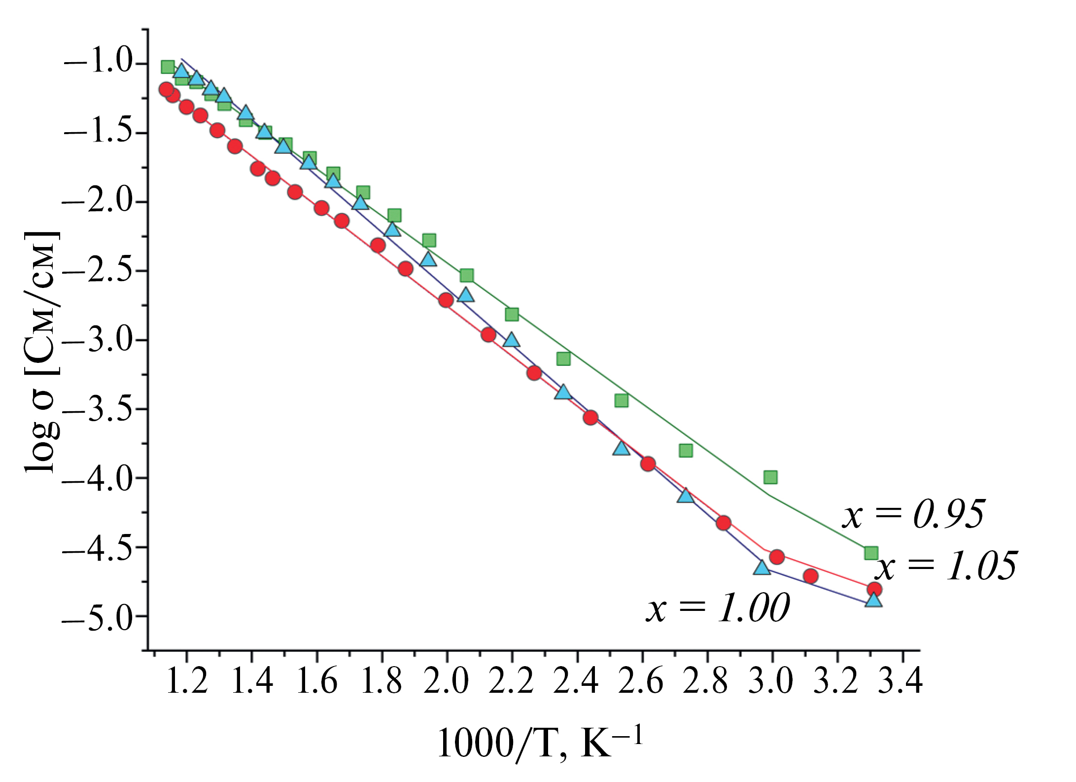 Рис. 3. Зависимость проводимости от температуры для Li3−2xNbxCr2−x(PO4)3
