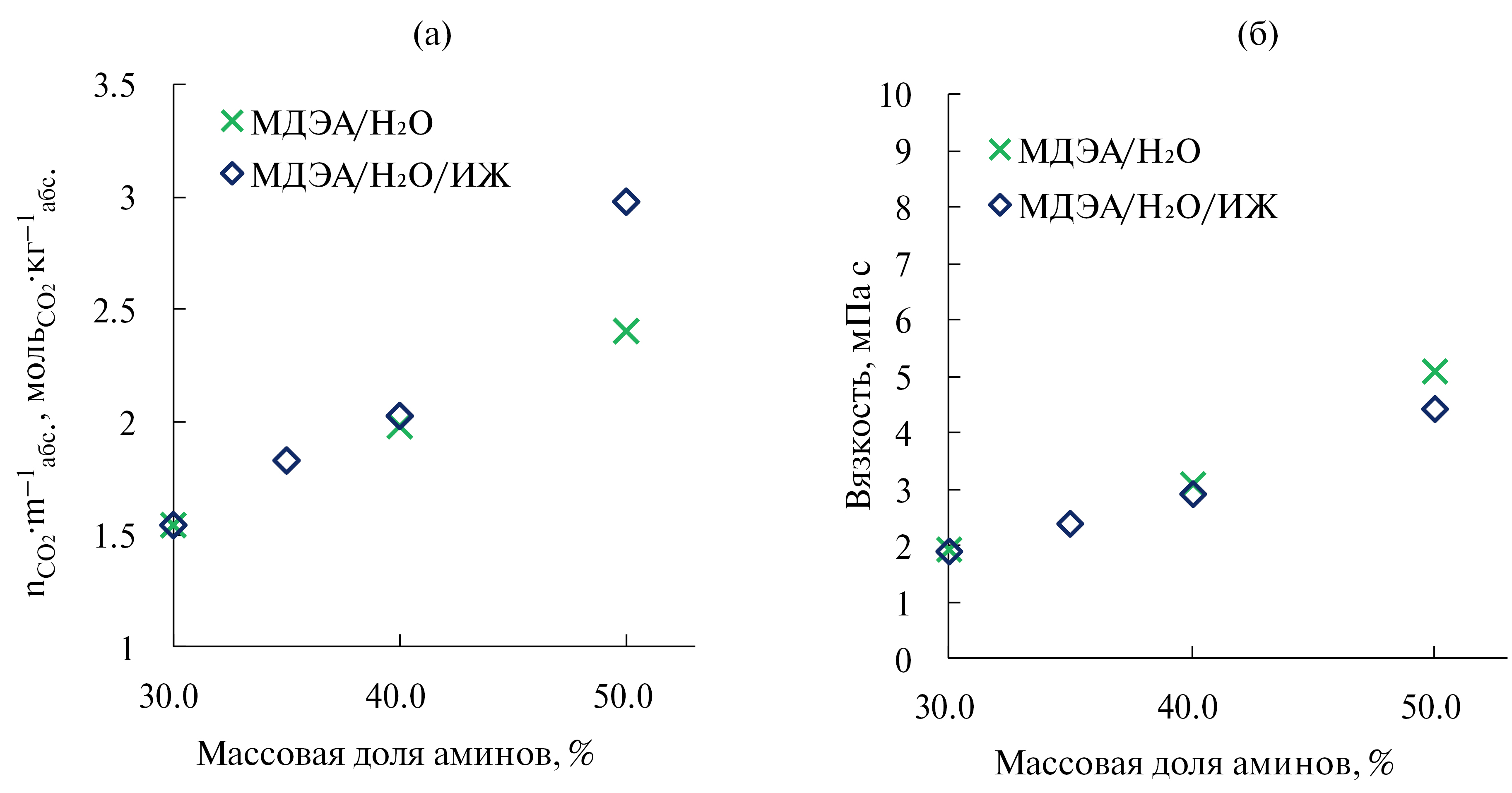 На рис. 7 представлены зависимости сорбционной емкости (рис. 7а) и вязкости (рис. 7б) водных растворов МДЭА от массового содержания аминов, соответственно. При общем содержании аминов 40 масс. % сорбционная емкость водного раствора МДЭА 30% / ИЖ 10% (2.03 ), хоть и незначительно, но превышает это же значение для водного раствора МДЭА 40% (1.98 ) [44], в то время как вязкость водного раствора МДЭА 30% / ИЖ 10% (2.94 мПа·с) ниже, чем для водного раствора МДЭА 40% (3.11 мПа·с) [43–45] (рис. 7б).
