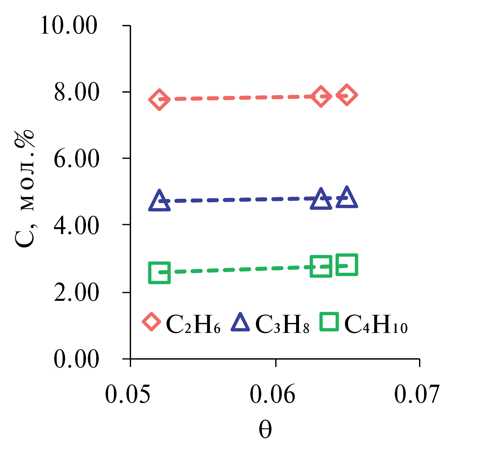 Таким образом, совокупный анализ зависимостей концентраций углеводородов от величины доли отбора показывает, что по всем этим компонентам наблюдается незначительное концентрирование при проведении процесса с долей отбора ≥ 0.065. Такой характер полученных зависимостей объясняется тем, что все эти компоненты, во-первых, слаборастворимы в применяемом жидком абсорбенте, а во-вторых, используемая мембрана, характеризуется низкими значениями проницаемостей по этим газам. Таким образом, применение гибридного метода – мембранно-абсорбционного газоразделения позволяет незначительно сконцентрировать эти компоненты в отбираемом потоке ретентата.