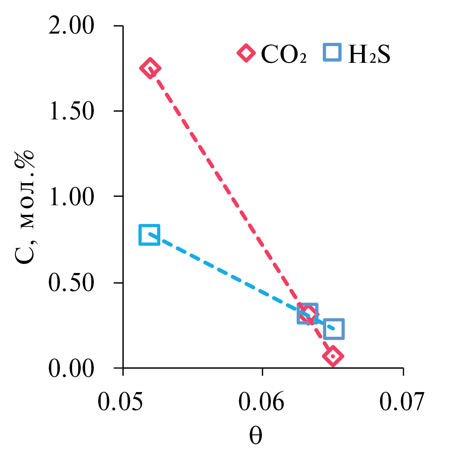 На рис. 12 представлены зависимости содержания диоксида углерода и сероводорода в потоке ретентата от величины доли отбора. Из полученных зависимостей видно, что увеличение доли отбора сопровождается снижением содержания диоксида углерода в потоке ретентата, отбираемом из мембранно-абсорбционного газоразделительного модуля. Так, при доле отбора равной 0.052, достигается максимальная концентрация диоксида углерода, которая составляет 1.76 мол. %. Проведение процесса при значении доли отбора 0.065 позволило снизить содержание диоксида углерода до 0.07 мол. %. При этом, наблюдается существенное снижение концентрации диоксида углерода в сравнении с его начальным содержанием в смеси (5.40 мол. %). Таким образом, при проведении процесса с долей отбора равной 0.065, концентрация диоксида углерода снижается на 99%. Полученная зависимость объясняется тем, что диоксид углерода, является хорошо растворимым газом в водном растворе метилдиэтаноламина, а добавление в раствор синтезированной ИЖ повышает эффективность абсорбции СО2. Кроме того, мембрана характеризуется высокой проницаемостью по этому компоненту. Таким образом, в рассматриваемом процессе, диоксид углерода способен эффективно растворяться в слое жидкого абсорбента и перемещаться в подмембраннное пространство мембранно-абсорбционного газоразделительного модуля.