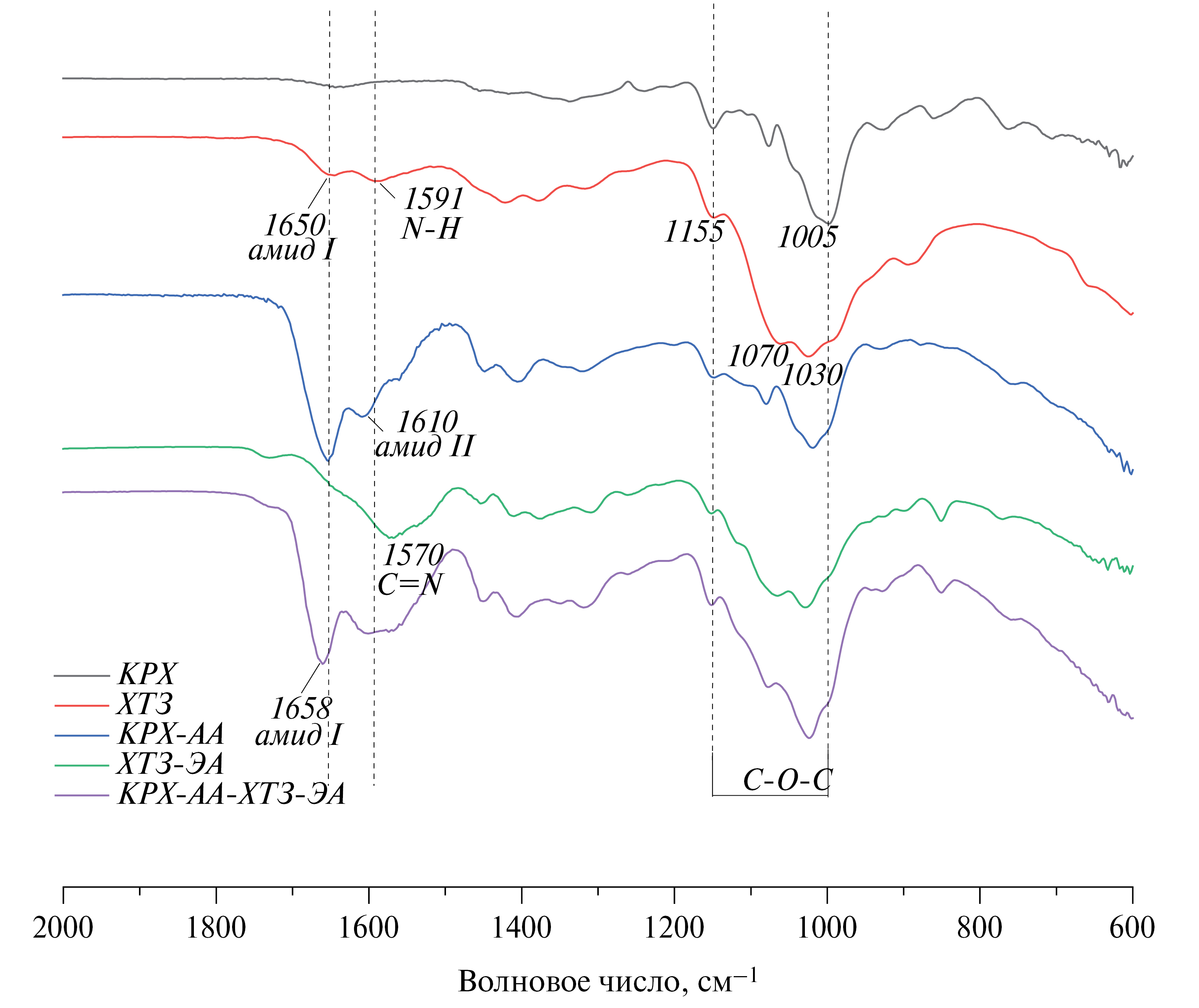 ИК-спектры были получены на приборе IRTracer–100 Shimadzu (Япония) с использованием приставки нарушенного полного внутреннего отражения (НПВО) (PIKE, США). Усредняли 30 сканирований с разрешением 4 см–1 в диапазоне 2000–600 см–1. Спектры порошкообразных крахмала и хитозана, а также пленок ХТЗ–ЭА и КРХ–АА–ХТЗ–ЭА были получены без предварительной пробоподготовки образцов. Для получения спектра сополимера КРХ–АА твердый образец тщательно измельчали в агатовой ступке.