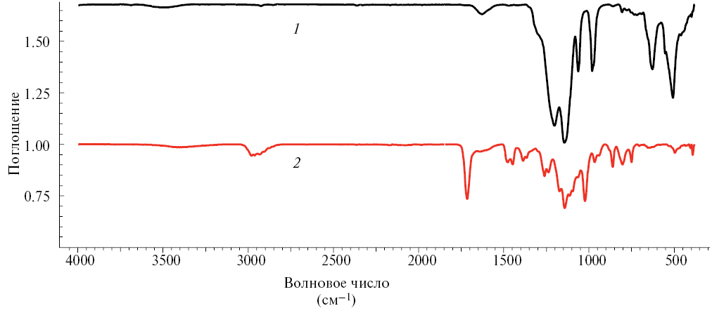 Рис. 2. ИК-спектр бислойной мембраны МК-2 со стороны катионообменного слоя (1) и со стороны анионообменного слоя (2).