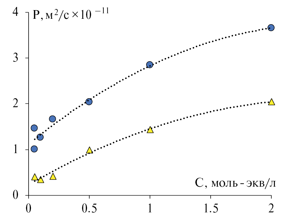 Для определения коэффициентов диффузии ионов Na+ и Ca2+ в мембране МА-1 измерялись коэффициенты диффузионной проницаемости электролитов хлорида натрия и хлорида кальция. Коэффициенты диффузионной проницаемости определялись путем измерения диффузионных потоков индивидуальных электролитов (NaCl и CaCl2) через мембрану в деионизированную воду по методике [29].