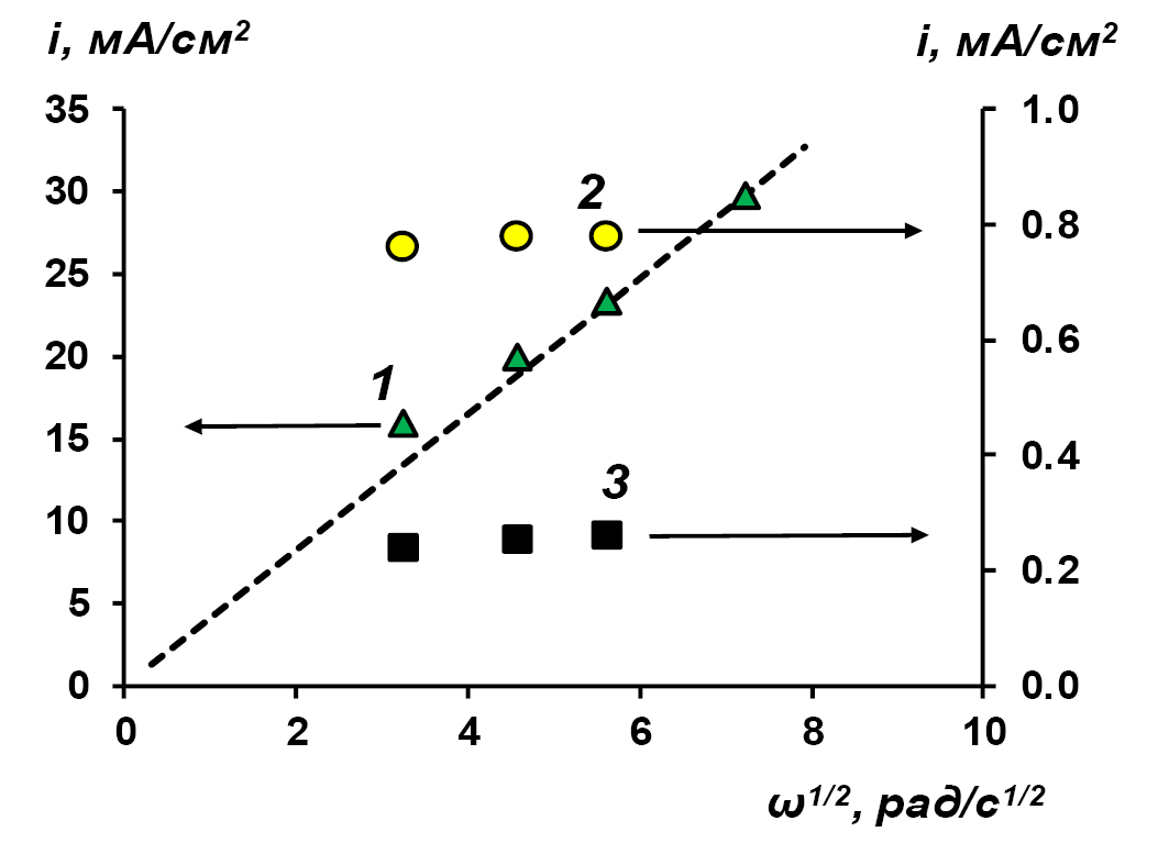 Рис. 7. Зависимость предельной плотности тока от квадратного корня угловой скорости ВМД в смешанном растворе 0.015 моль-экв/л NaCl и 0.015 моль-экв/л CaCl2. Пунктирной линией показаны значения предельной плотности тока, рассчитанные по формуле 7. Маркерами показаны экспериментальные значения предельных токов, найденные методом касательных для мембран: 1 – МФ-4СК; 2 – МК-1; 3 – МК-2.