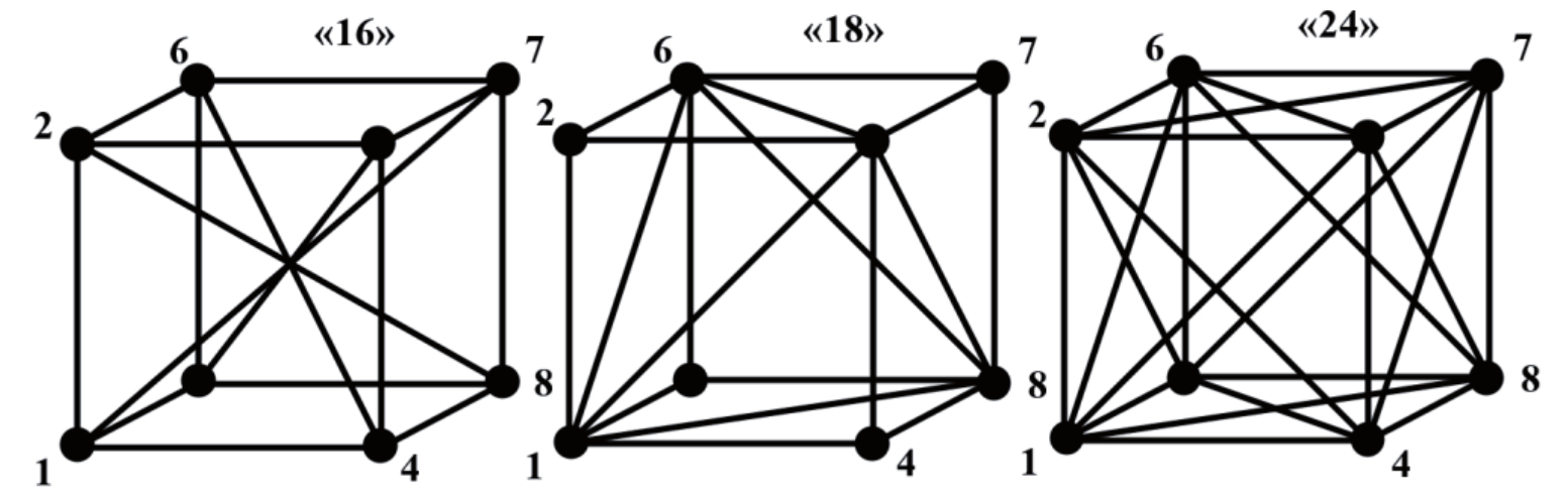 Можно предположить, что стержни линейно-упругие, соединены в узлах шарнирно и одинаково работают на растяжение – сжатие. Данная конструкция представляет собой механизм. Геометрически неизменяемые конструкции далее образуются добавлением стержней в плоскостях граней и внутри решётки. Для нумерации структур и соответствующих конструкций используется общее количество стержней. Рассматриваются следующие структуры возрастающей сложности.