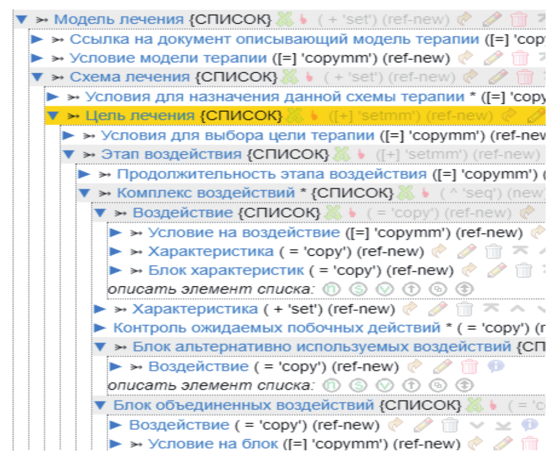 Лечение может быть разделено на этапы, каждый этап лечения представляет собой набор клинических мероприятий, организованный либо по временным отрезкам, либо по достижению показателей, соответствующих цели лечения. Каждый этап лечения содержит комплекс воздействий и продолжительность этапа воздействия. Структура раздела Комплекс воздействий позволяет формировать знания о любых манипуляциях с пациентом по различным видам лечения (cм. рисунок 3).