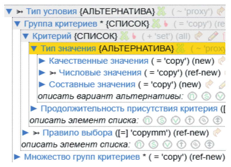 Для персонификации лечения предусмотрен многоуровневый комплекс условий, контролирующих возможность проведения медицинских мероприятий (см. рисунок 4). Каждое условие формально представлено клиническим комплексом критериев с чётко определёнными значениями. Под критерием понимается любой элемент записи в истории болезни, например: признак, параметр, наблюдение, заболевание, результат исследования, относящийся к персональным данным пациента или отражающий особенность клинической картины заболевания.