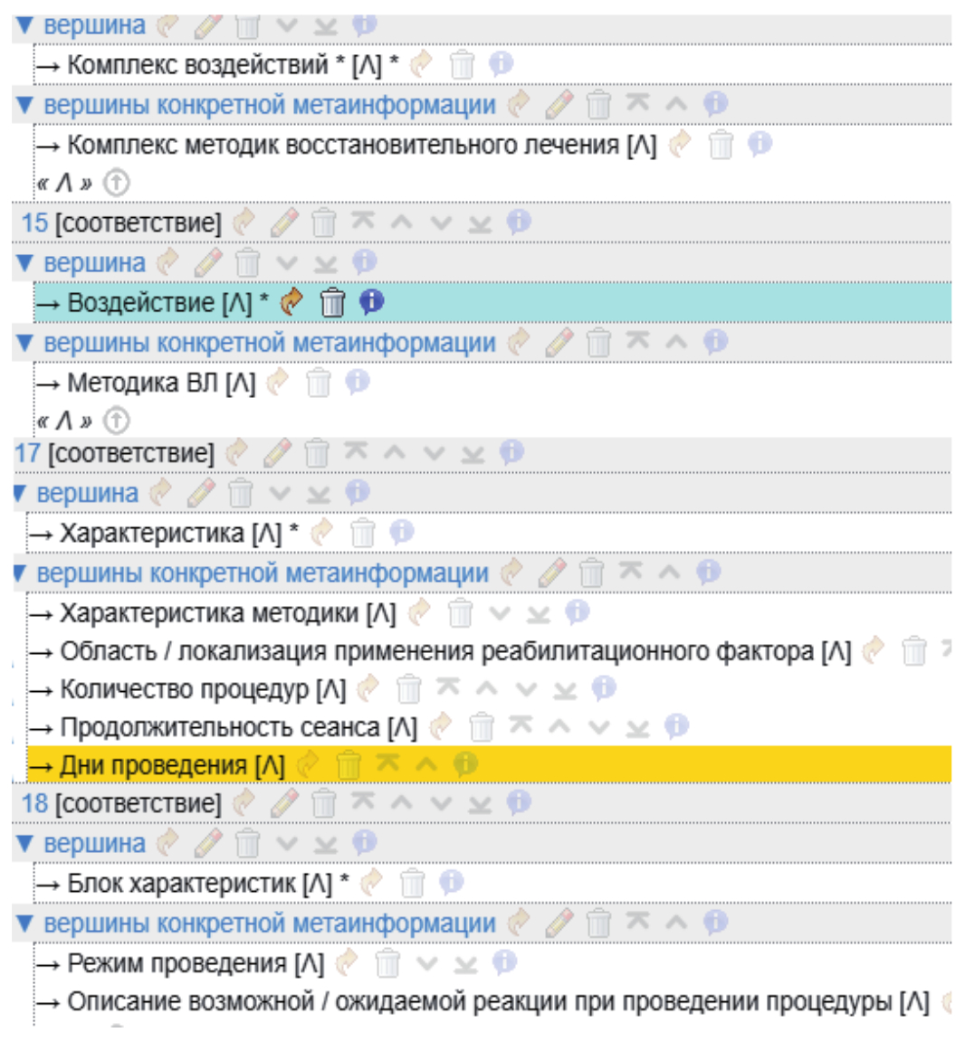 Блок Характеристика также содержится и в разделе Комплекс воздействий. На данном уровне онтология используется для формализации второстепенных элементов процесса терапии, например противопоказания, рекомендации и т.д.