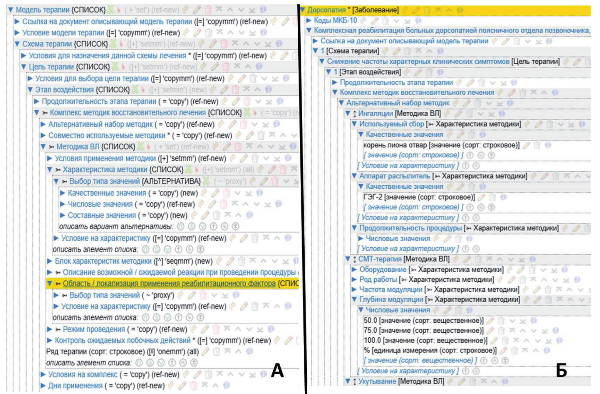 В результате формируется специализированная онтология, соответствующая восстановительному лечению (см. рисунок 11А). Аналогично можно формировать различные БЗ по восстановительному лечению заболеваний (см. рисунок 11Б).