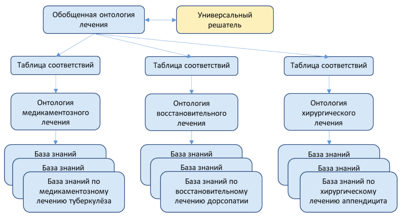 В предложенном подходе основу составляет обобщённая онтология лечения, которая через таблицу соответствия может быть адаптирована к целевой онтологии (восстановительного, медикаментозного, хирургического лечения). Универсальный решатель основан на обобщённой онтологии, поскольку все блоки и разделы обобщённой и специализированных онтологий имеют одинаковую структуру и семантический смысл и, как следствие, идентичный алгоритм обработки (решатель). Любая модификация онтологии не влечёт изменения решателя. Эксперты ПрО формируют БЗ в терминах специализированных онтологий, которые могут быть гибко (через таблицу соответствий) адаптированы к их требованиям.