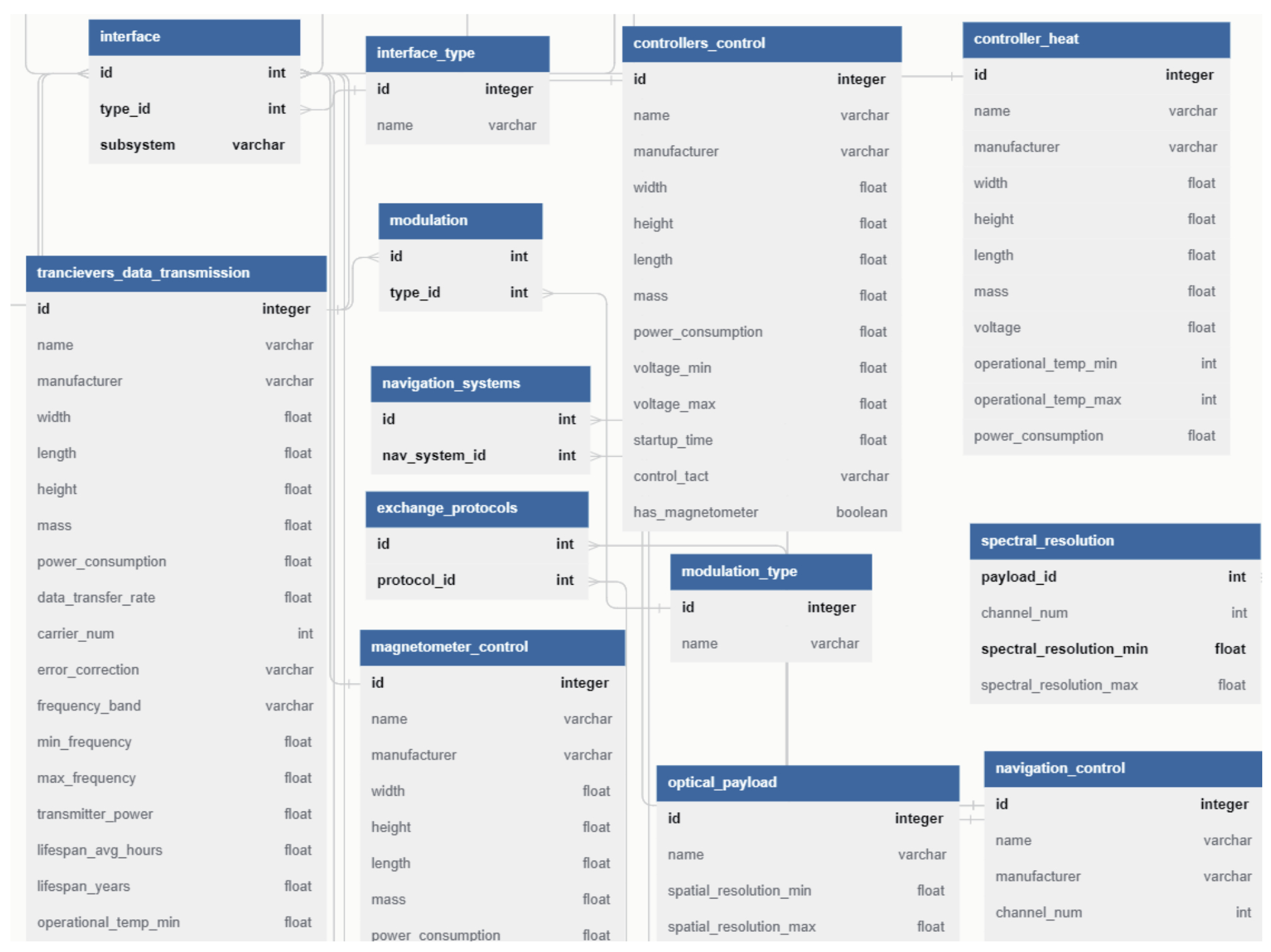 В таблицах, описывающих аппаратуру и компоненты КА, используются суррогатные первичные ключи. В промежуточных таблицах, отражающих связи вида «многие ко многим», используются составные первичные ключи.