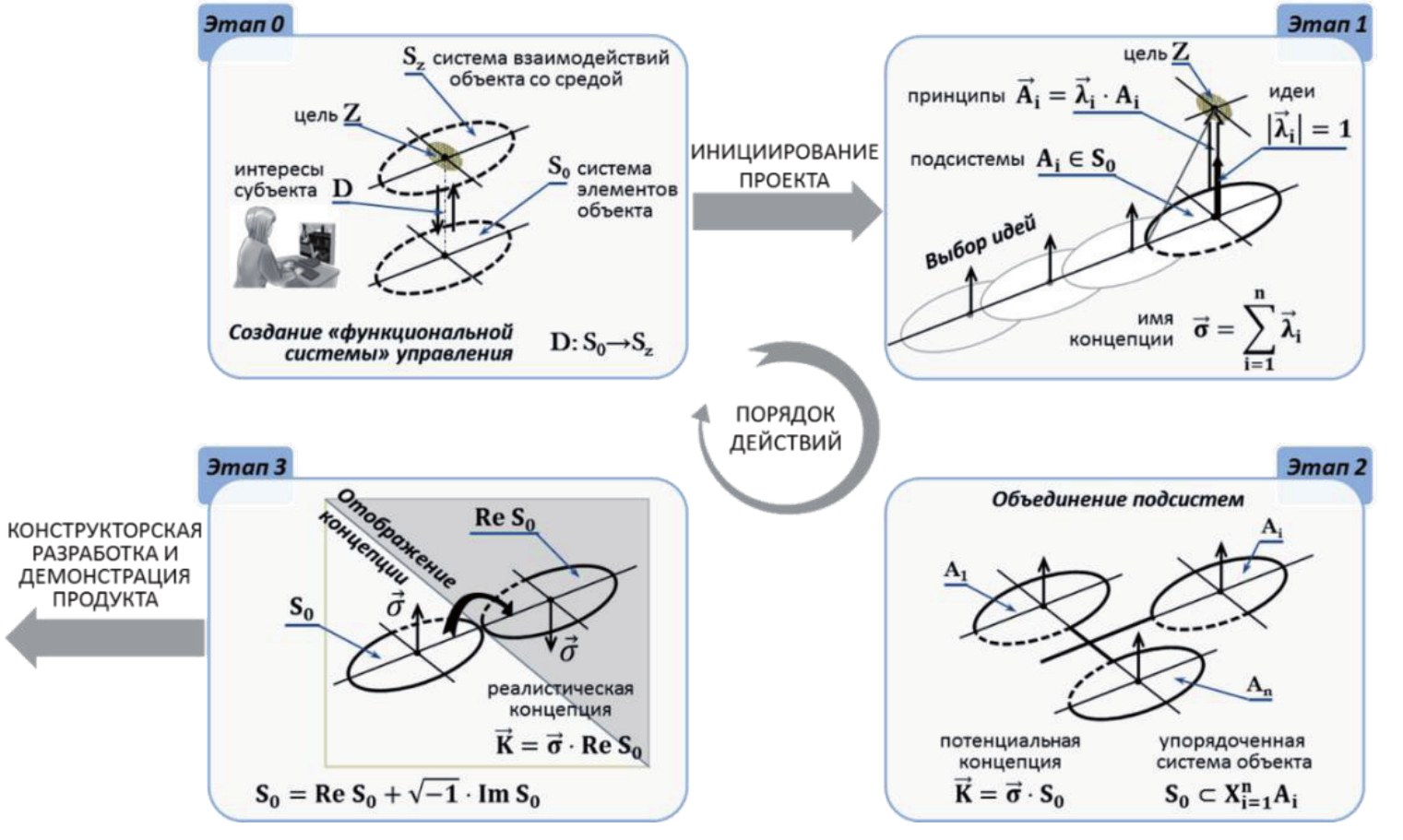 Трансфер технологий. Подобие моделей есть простейшее преобразование во взаимно однозначных (конформных) отображениях трёхмерного оригинала и его образа. На концептуальной стадии проекта оригиналом является сочетание идей – векторное имя концепции как прообраз её скалярного содержания, заключённого в объектовой системе S0. При этом суммарный вектор идей направлен в сторону их источника, неизменного на всех этапах развития концепции (рисунок 4). Являясь информационным проводником оригинала, концепция объекта () отображается в своих образах-аналогиях - в физических и иных моделях, проявленных на Этапе 3 в квазиреальных условиях применения будущего объекта. Вслед за этим управление проектом и направление вектора изменяются. Экспериментальные модели останутся образами, но оригинал в новом отображении будет другим. Им станет будущий натурный объект. Дальнейшие разработки проводятся на материальной основе и в реальных условиях.