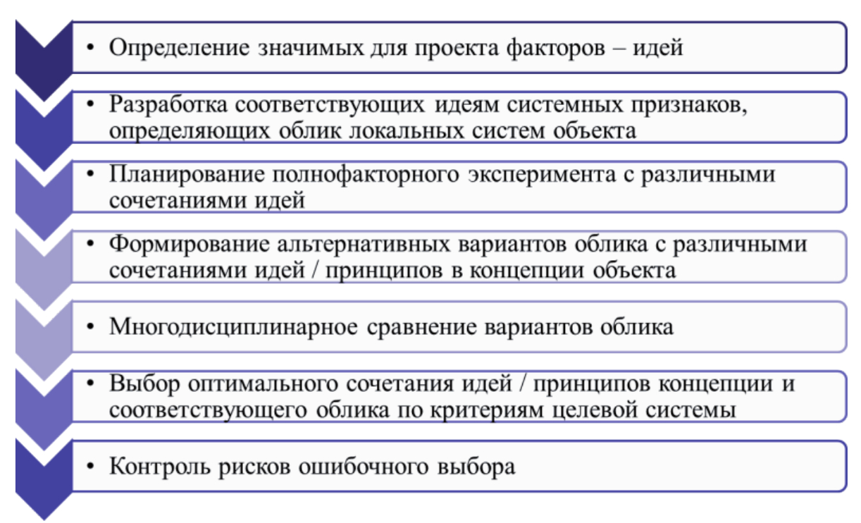 На этапах «Анализа идей» и «Синтеза системы» научные методы позволяют численно определить вероятность успеха и риски в решении соответствующих задач. На этапе «Аналогии концепции» устраняются неопределённости критических характеристик для ключевых проектных решений.