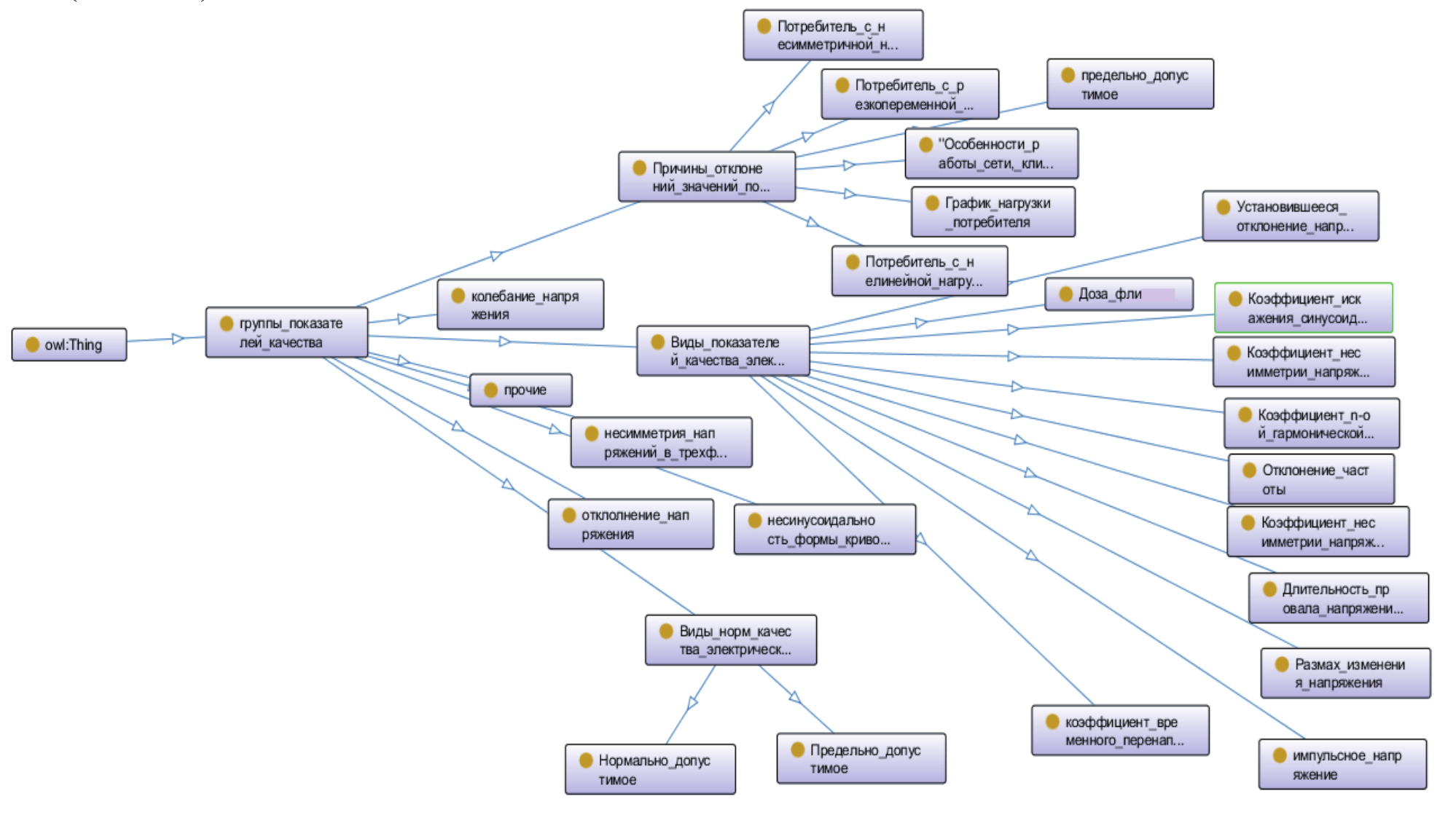 В объекте управления выделяются количественные характеристики ИО, а на их основе формируются качественные характеристики ИО в интеллектуальном ПАК. К ним относятся группы показателей качества ЭЭ (ПКЭЭ) (рисунок 2), которые состоят из видов ПКЭЭ (ВПКЭЭ), причин отклонений показателей качества ЭЭ (ПОПКЭЭ) и видов норм качества ЭЭ (ВНКЭЭ).