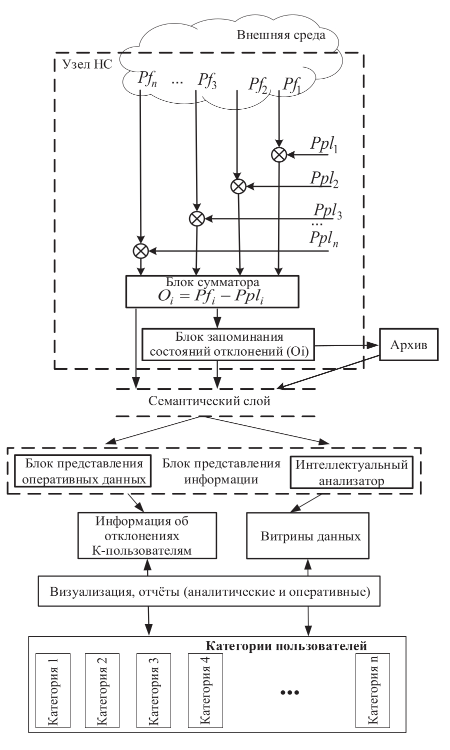 Результаты работы НС поступают в блок запоминания состояний, из которого переходит в архив хранилища данных. Семантический слой позволяет пользователю получать данные, являющиеся результатом работы узла НС. Витрины данных, в свою очередь, являются хранилищем данных, предназначенным для определённых категорий пользователей.