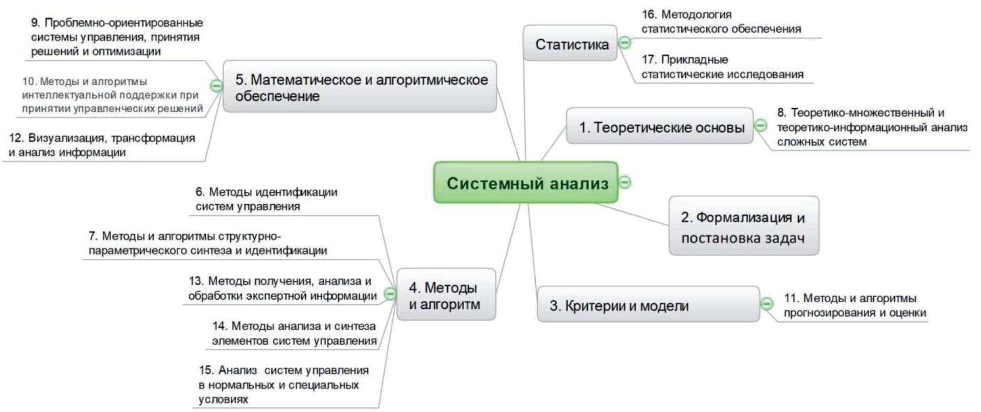 В действующей номенклатуре НС для НС 2.3.1. «Системный анализ, управление и обработка информации, статистика» содержание НИ в этой НС можно проиллюстрировать в виде графа знаний, который приведён на рисунке 6. Принятая в паспорте этой НС нумерация сохранена. При этом сделана попытка обобщить содержание некоторых НИ, выделив: теоретические основы, формализацию и постановку задач, критерии и модели, методы и алгоритмы, математическое и алгоритмическое обеспечение. Особняком стоит «статистика», которая была включена в последнюю редакцию этой НС. Возможно, разработчики этой НС решили, что статистические методы соответствуют ключевой фразе этой НС «обработка информации», и это позволило объединить в одной НС статистику и СА. Пример со статистикой наглядно показывает трудности дифференциации и интеграции знаний и разработки на этих основах классификаций в науке [2].