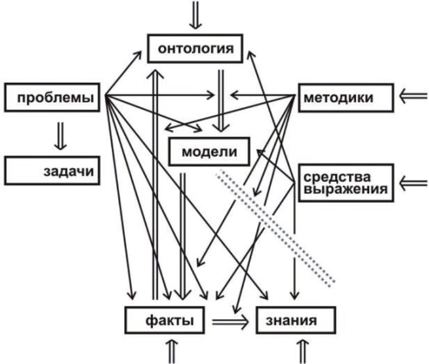 Модели-конфигураторы после того, как с их помощью произведён синтез имеющихся знаний, сохраняются и развиваются, переходя в онтологию НП и становясь особым, постоянно действующим слоем всякой науки. Необходимо ещё до начала научного исследования объекта построить планкарту исследования, определить средства и метод работы. Всё здание науки начинает строиться с методологии [48], задающей план и программу всех исследований, а затем всё остальное, вплоть до системы формальных знаний теории.