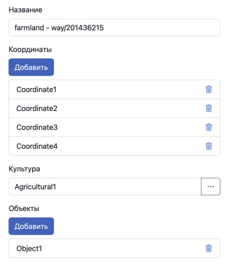 - параметры поля: координаты границы поля, характеристики почвы, показатели урожайности СХ культур, история использования поля, наличие вредителей и др.;