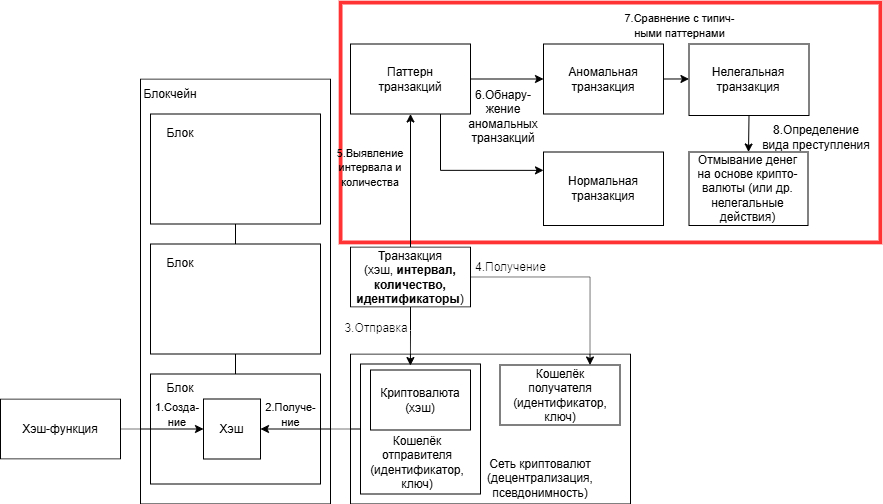 В большом прямоугольнике сверху справа показан участок области используемого в данной работе подхода, который основан на отношениях 5–8. Цель подхода заключается в выявлении аномальных транзакций на основе их статистических данных (отношение 6). Под статистическими данными транзакции понимаются данные, которые вычислены на основе таких важных для полученной схемы атрибутов транзакции, как интервал между транзакциями, количество транзакций и идентификаторы отправителя и получателя. Чтобы обнаружить аномалию, необходимы статистические данные о транзакции, поэтому важно отношение 5 – выявление интервала между транзакциями и их количества. При этом не любая аномальная транзакция может оказаться нелегальной. Для того чтобы достоверно определить её нелегальность, нужно сравнить её поведение с паттернами, типичными для нелегальных транзакций (отношение 7). Отношение 8 показывает, что последующий анализ позволит определить конкретный тип операции с криптовалютой.