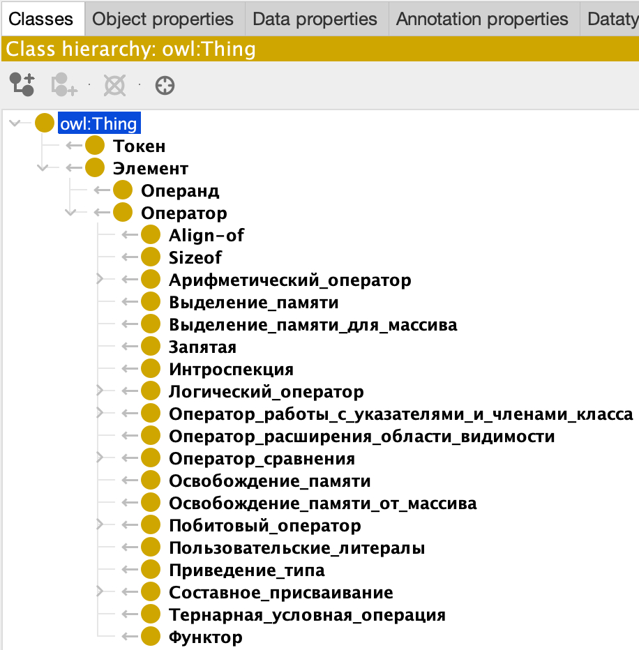 Рисунок 2 – Верхний уровень иерархии онтологии выражения на языке программирования на примере C++ (выполнено в редакторе Protege)