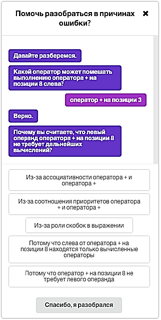 Полезной функцией ИТ является отображение следующего правильного шага с пояснением, почему этот шаг является правильным. Отсутствие подсказок может приводить к попытке решить задачу перебором возможных вариантов, что не является конструктивным для освоения материала. Для получения подсказки обучаемый должен выбрать соответствующую кнопку. Поясняющее сообщение подсказки принимает во внимание две ближайших операции, которые ещё не были вычислены (слева и справа от той, которая была выбрана) и описывает, почему выбранная операция может быть вычислена на текущем шаге.