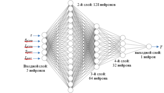 Рассмотрена задача построения приближённого представления ММ, описанной в разделе 1, при помощи искусственной НС. В качестве параметров для обучения НС и получения распределения температуры исследованы четыре геометрических размера: площадь сечения плиты и образца , их длины и . Свойства материала и ГУ остаются неизменными. Таким образом, температура является функцией пяти аргументов: . Заданы следующие диапазоны изменения этих параметров: где для краткости обозначено , а – некоторое начальное значение параметра. Диапазон изменения координаты определяется максимальными значениями длин плиты и детали: