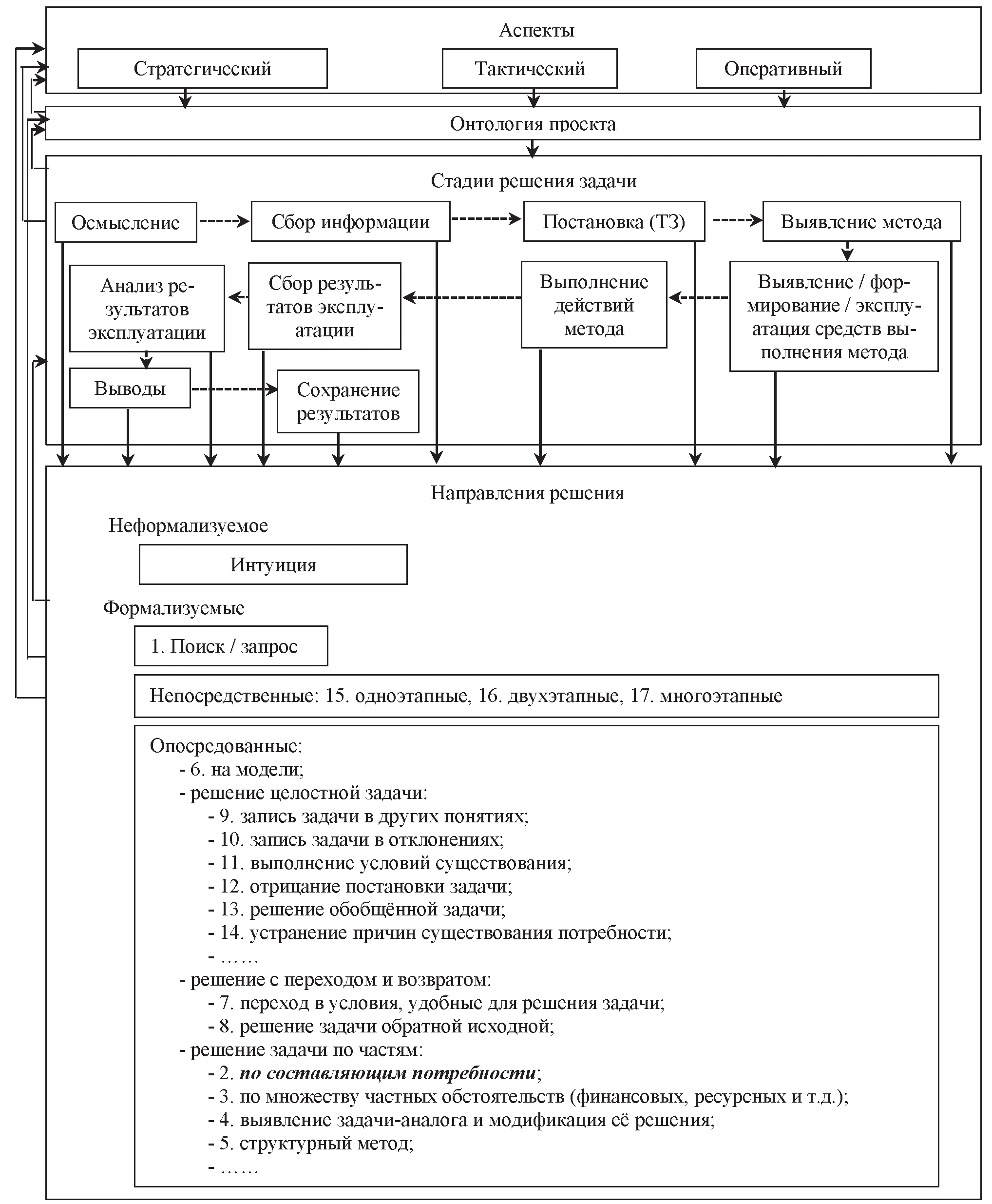 В общем случае удовлетворение потребности, порождающей задачу, проходит через ряд стадий [9]: 1) осмысление потребности (в данном случае – это требования к проекту, действующие и возможные ограничения) и возникновение замысла по удовлетворению этой потребности; 2) сбор информации; 3) постановка задачи (сформулированная потребность, условия решения, требования к решению и его качеству; 4) выявление метода решения; 5) формирование и использование средств выполнения метода; 6) выполнение действий метода; 7) сбор результатов применения метода; 8) анализ результатов; 9) выводы (формирование новых задач, в т.ч. и корректировка исходной постановки задачи); 10) сохранение результатов полученного опыта.