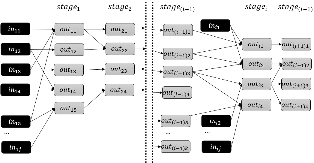 Выходные значения одной стадии могут являться входными для следующей: