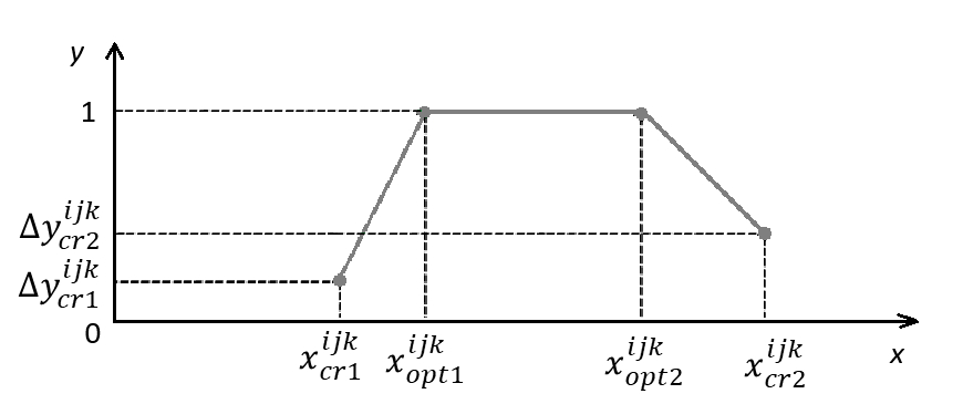 На рисунке 2 показан пример трубки входного параметра х и выходного параметра y, состоящей из четырёх точек: критического минимума , рекомендованного минимума , рекомендованного максимума , критического максимума входного параметра для каждой фазы и соответствующим им значений прироста выходных параметров , , , .