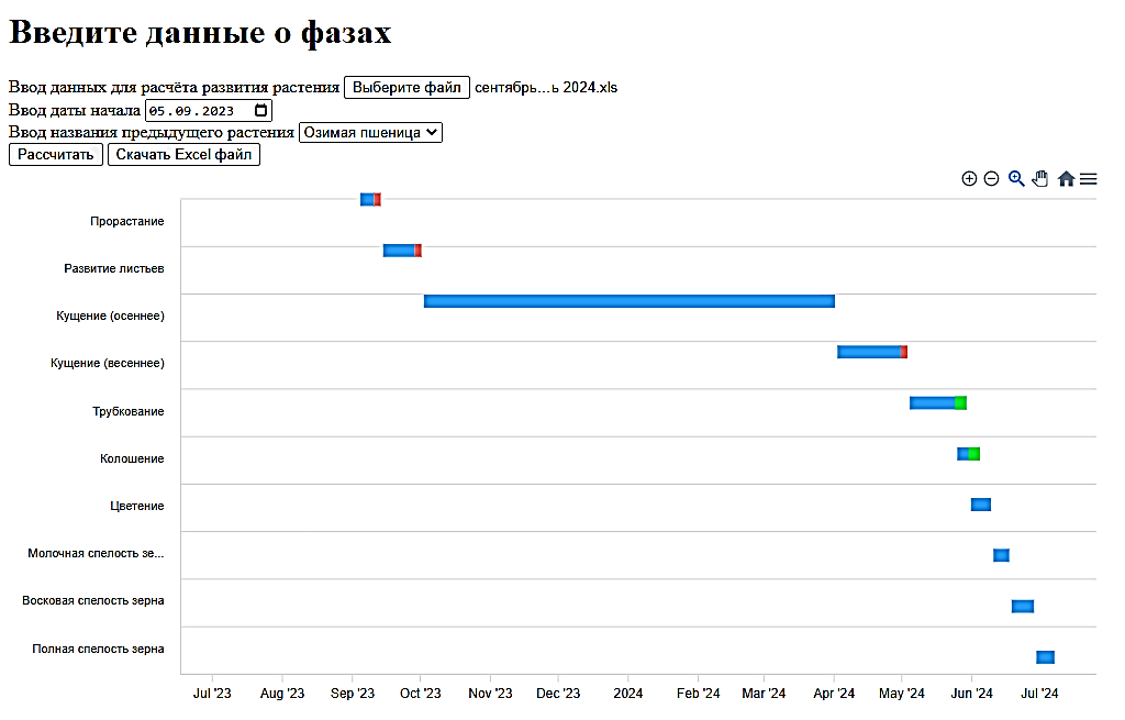 Проведено сравнение фактических дат начала и конца фаз с/х культуры c рассчитанными значениями (рисунок 9). Из рисунка видно, что разница между значениями фактических и рассчитанных дат не превышает 14 дней. Дата фактического сбора урожая была 16.07.2024, а дата рассчитанного сбора – 28.07.2024.