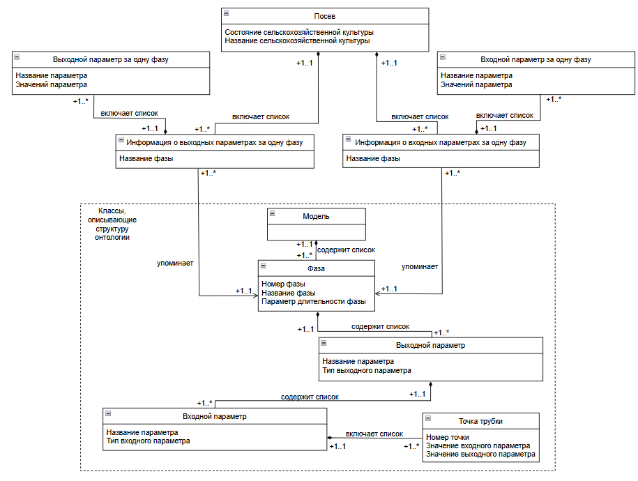 На рисунке 5 показана диаграмма основных классов системы. Класс «Модель» включает список фаз растения, каждая фаза состоит из номера, названия, списка выходных параметров и длительности фазы. Для каждого выходного параметра задаётся список входных параметров. На рисунке 5 классы, изображенные снизу, соответствуют структуре онтологии, которая загружается в систему в виде json файла. В одном json файле хранится модель растения одного сорта. Такая модель состоит из списка фаз роста и развития растения. Количество и названия фаз индивидуальны для каждого растения. Фазы состоят из выходных параметров. На каждый выходной параметр влияет входной параметр. Это влияние описано в трубках. Так как сорта растений отличаются друг от друга, то входные и выходные параметры задаются индивидуально.