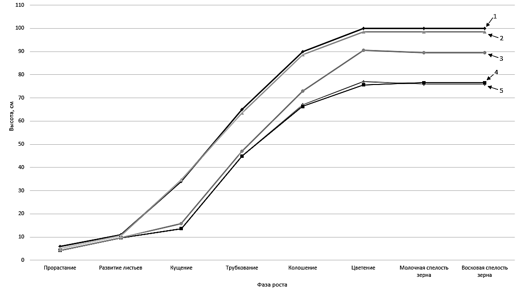 Рисунок 8 – Пример графика параметра высоты растения с различными сценариями. 1 – норма высоты растения, 2 – результат эксперимента сценария благоприятных условий, 3 – результат эксперимента сценария перенасыщения питательными веществами, 4 – результат эксперимента сценария засухи, 5 – результат эксперимента сценария недостатка питательных веществ