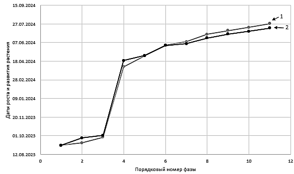 Рисунок 9 – Сравнение фактических и рассчитанных значений дат начала и конца фаз. 1 – рассчитанные значения, 2 – фактические значения